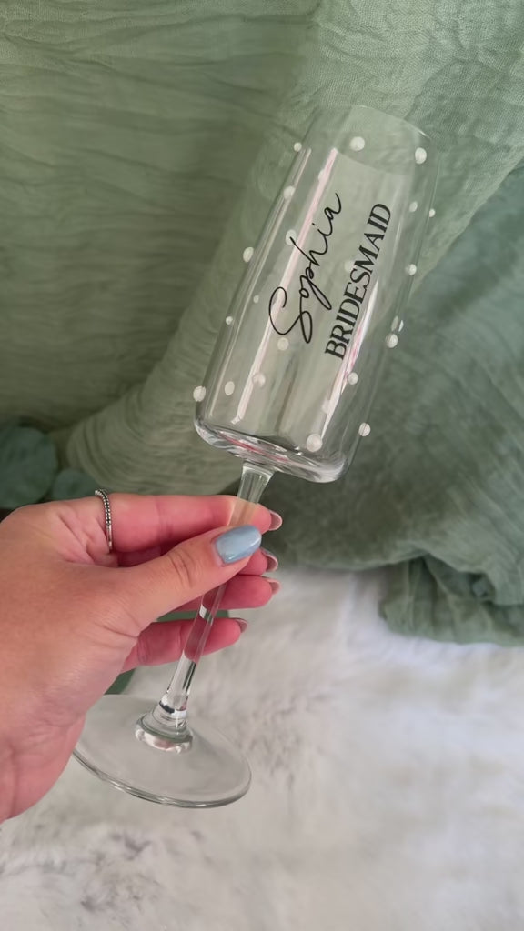 Elevate your wedding toast with our Personalised Pearl Wedding Flute. Each champagne flute is adorned with elegant ivory pearls and can be personalised with names in your choice of color. A perfect touch for the bridal party on the wedding morning. Make your special day even more memorable with this unique and sophisticated addition.