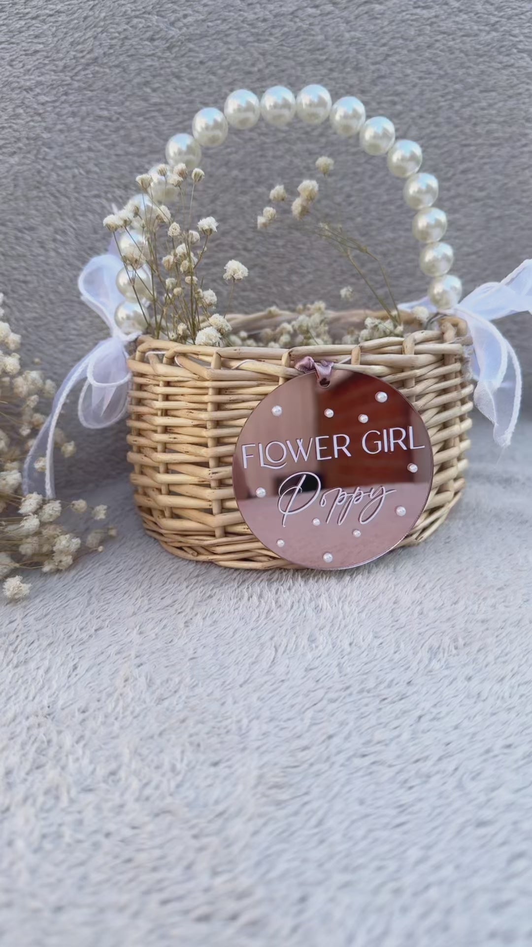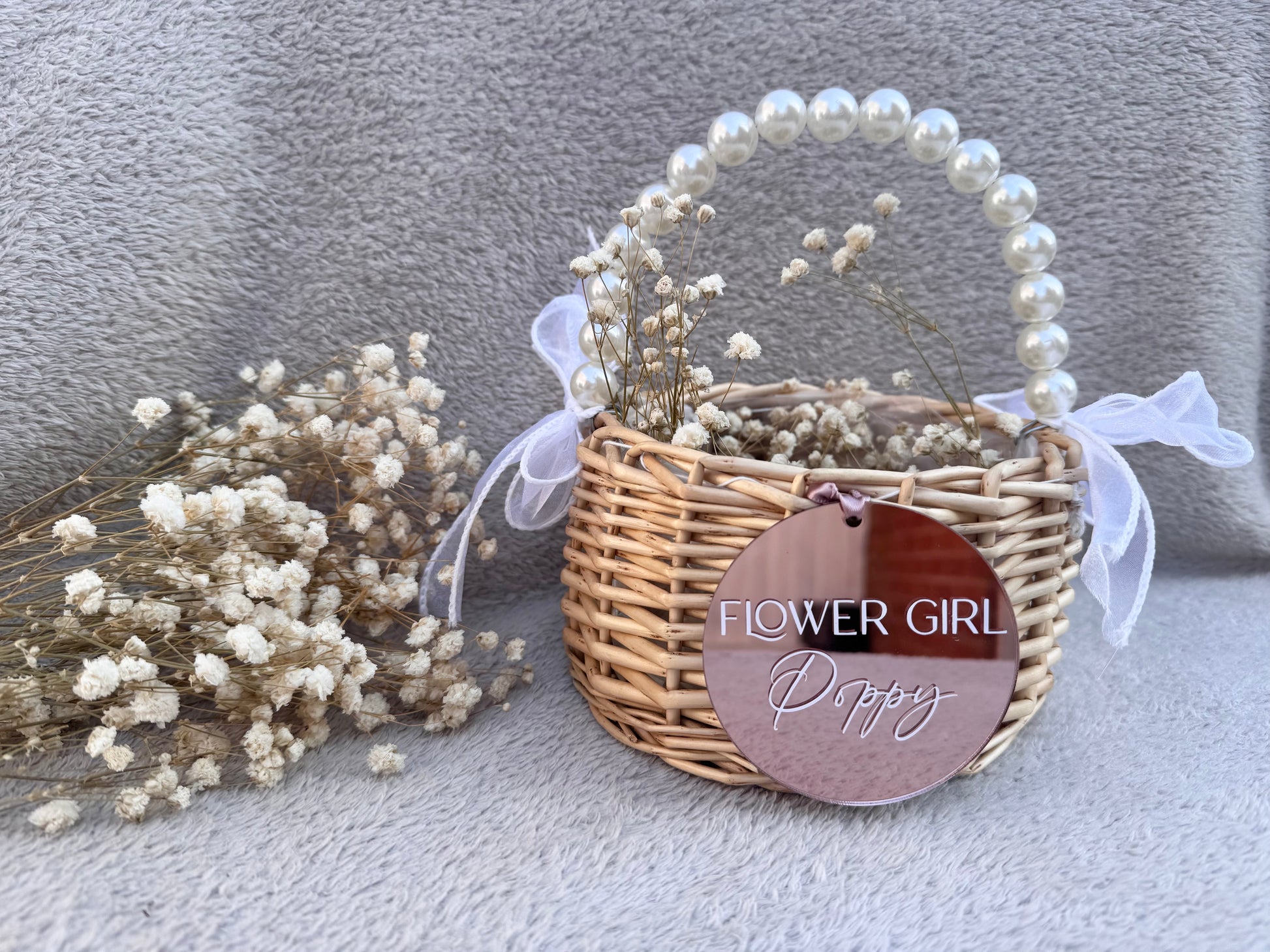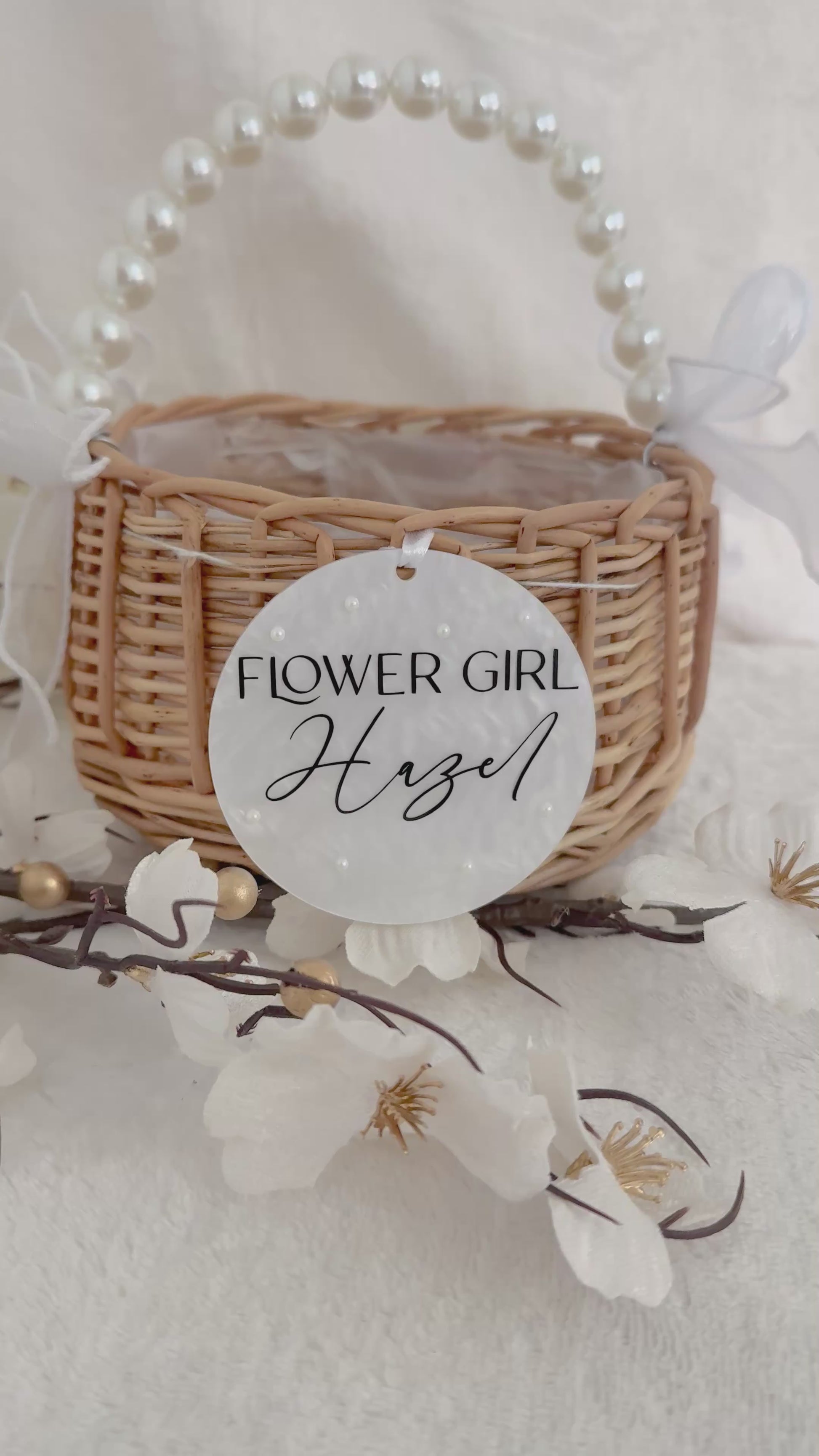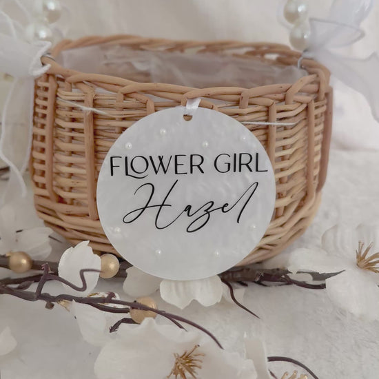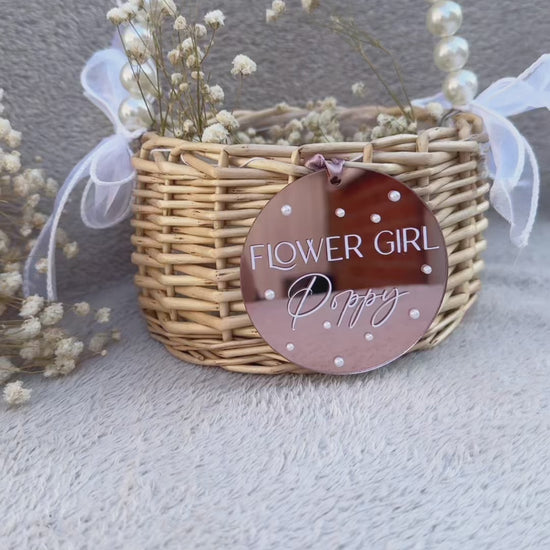 The personalised Flower Girl Basket is a charming addition to any wedding. With delicate pearl handles, this basket is perfect for your little flower girl to scatter petals as she leads the way down the aisle. Available with a rose gold hanging decoration, it's a beautiful and unique touch for your special day.